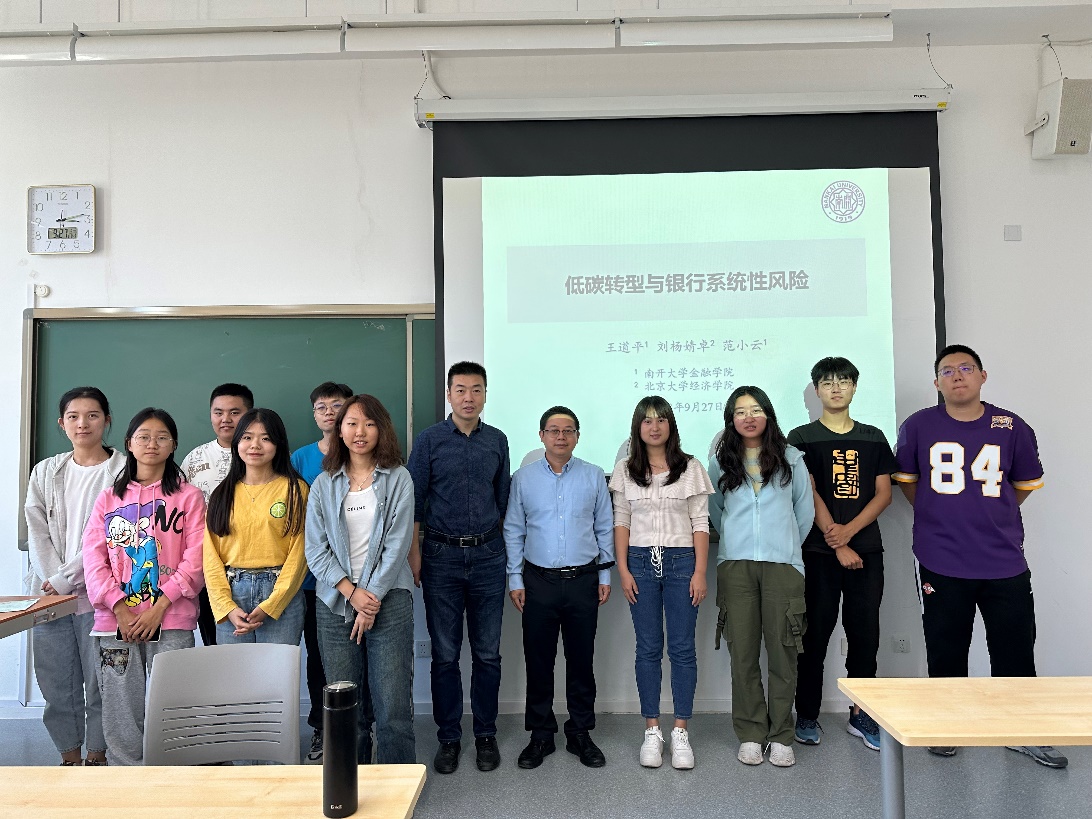 2023年9月27日下午,南开大学金融公司王道平副教授应邀在大数据与管理科学系列讲座上做了《低碳转型与银行系统性风险》主题报告。本次讲座在沙河二教203教室举行,由管理科学系魏璐老师主持,suncitygroup太阳成集团副经理荆中博老师和多位同学参加,共同探讨了低碳转型与金融系统性风险的关键问题。