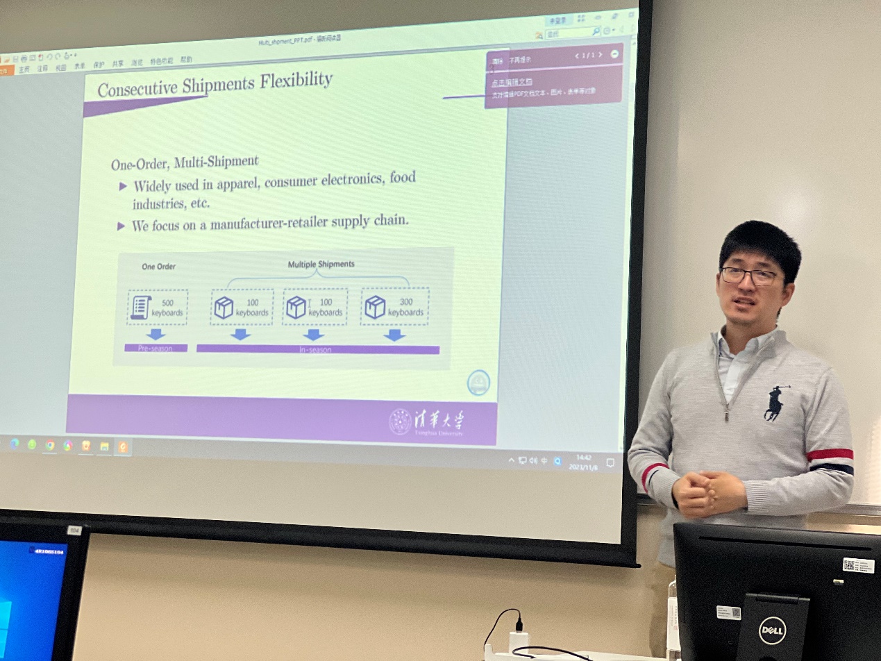 2023年11月8日下午2时,于沙河4号楼106,清华大学副教授、博士生导师邓天虎应邀在建设经济与管理系列论坛上作《Globally Anchored and Locally Adjustable: Shipments with Consecutive Flexibility》主题报告。报告由建设经济与管理系吴国滨老师主持,公司副经理李玉龙教授、建设经济与管理系主任杨帆副教授、管理科学系教工党支部书记陈俊霖副教授、工程与项目管理和管理科学23级研究生参与了本次主题报告。