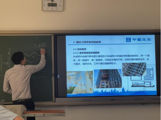 王总首先介绍了在国际工程承包领域,由于不同国家和地区在经济、文化、法律、政治等方面的差异,使得国际工程承包面临着多样化的挑战和机遇。并以其参与的英标美标项目为例,分析一般国际工程承包的共性特征,从项目差异和国家(地区)差异两个角度,探讨这些差异的表现及其背后的影响因素。此外,他还分享了随着中国建造走出国门,享誉海外,出现了许多由中国建造的海外标志性建筑,如科威特中央银行、瓜达尔机场等,同时分享了从事建筑行业的成就感,为同学们树立起行业认同与自豪感。