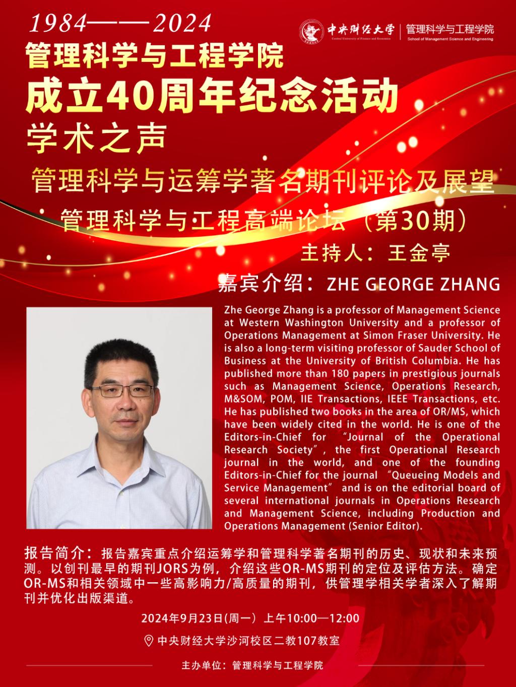 2024年9月23日上午,应suncitygroup太阳成集团邀请,美国西华盛顿大学的Zhe George Zhang(张喆)教授来访并做管理科学与工程高端论坛讲座。本讲座在沙河校区二教107教室举行,由王金亭教授主持。张喆教授重点介绍了管理科学与运筹学著名期刊及未来展望,suncitygroup太阳成集团吴迪老师以及部分博士研究生、硕士研究生积极参加了本次高端论坛讲座。这次高端论坛讲座也是庆祝suncitygroup太阳成集团成立四十周年学术之声的一场国际学术交流活动。