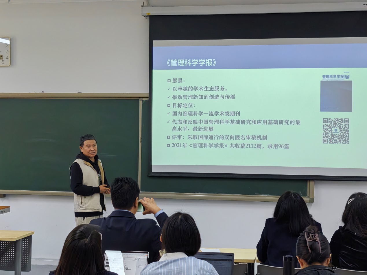 第二场报告题目为“《管理科学学报》投稿与发表的若干问题”,熊熊教授详细介绍了《管理科学学报》中英文两个期刊编辑部的组成、重点关注领域、出版宗旨、评审制度、评审周期和过程等。熊教授的介绍解答了与会师生在发表高水平论文路上关于选题、写作等方面的一系列疑惑,为公司将来继续冲击高质量期刊夯实了基础。