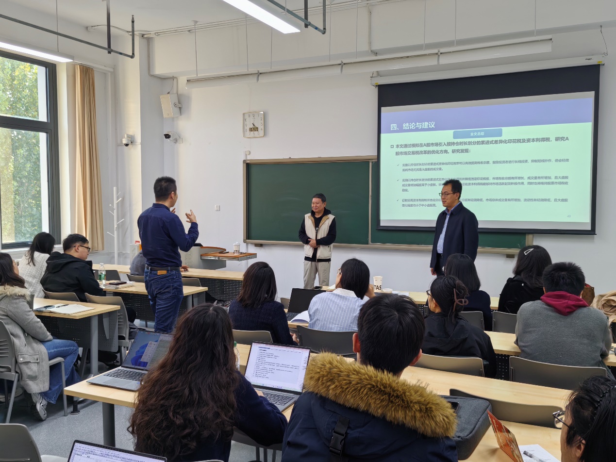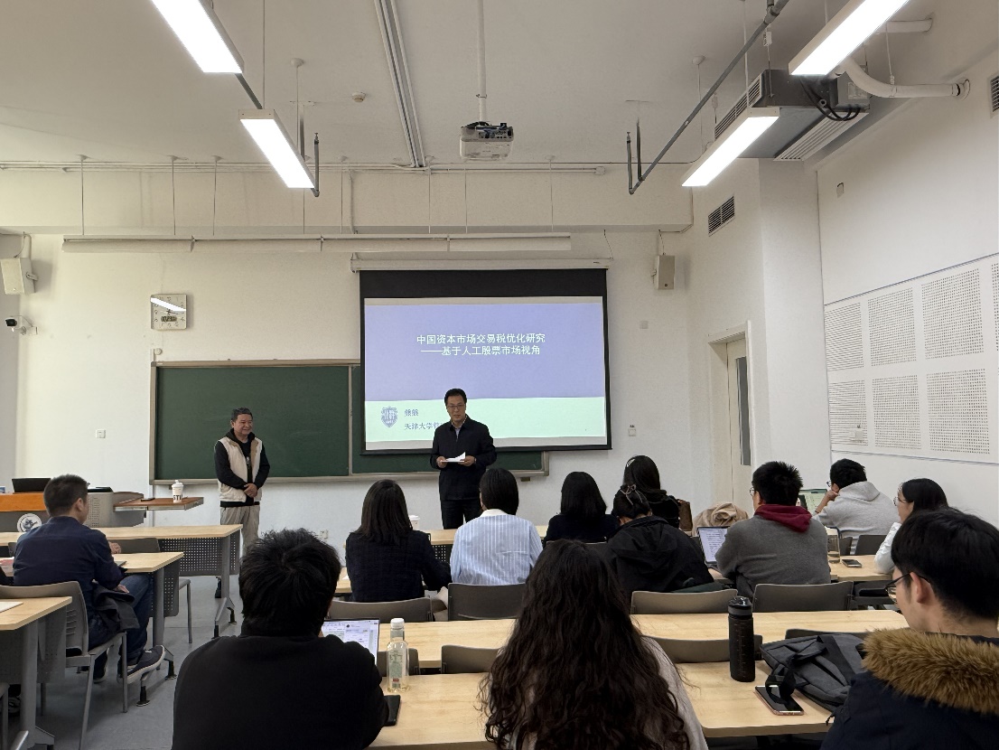 讲座分两场报告,第一场报告题目为“中国资本市场交易税优化研究—基于人工股票市场视角”。熊熊教授详细论述了其研究团队如何在交易税制改革的大背景下,研究不同交易税改革措施如何对市场交易者行为产生影响。他们构建具有A股市场微观结构以及交易行为特征的人工股票市场,进一步开展了交易税优化仿真实验研究。研究发现,与目前市场统一的征收0.1%固定印花税相比,降低印花税率并征收按持仓时长划分的累进式差异化资本利得税将有效提升市场成交量,同时也不会影响市场税收总额。熊熊教授最后提出了适合中国金融市场税制改革的政策建议,即可以考虑在A股市场开展征收资本利得税并降低印花税率的试点工作。