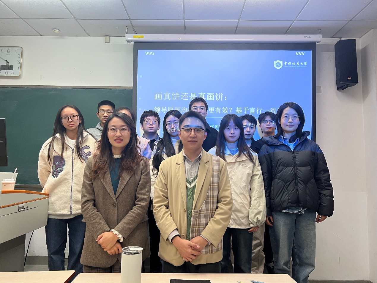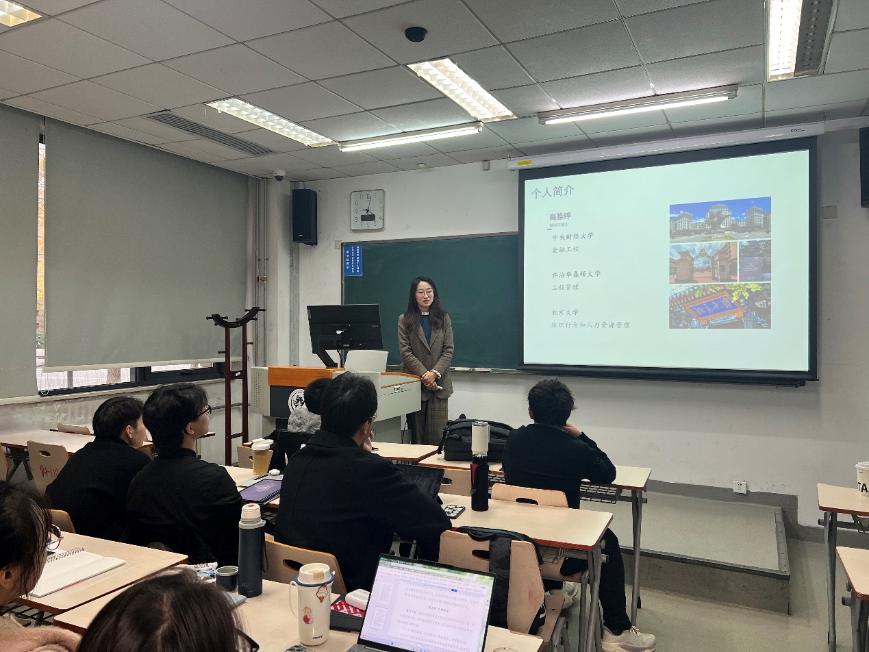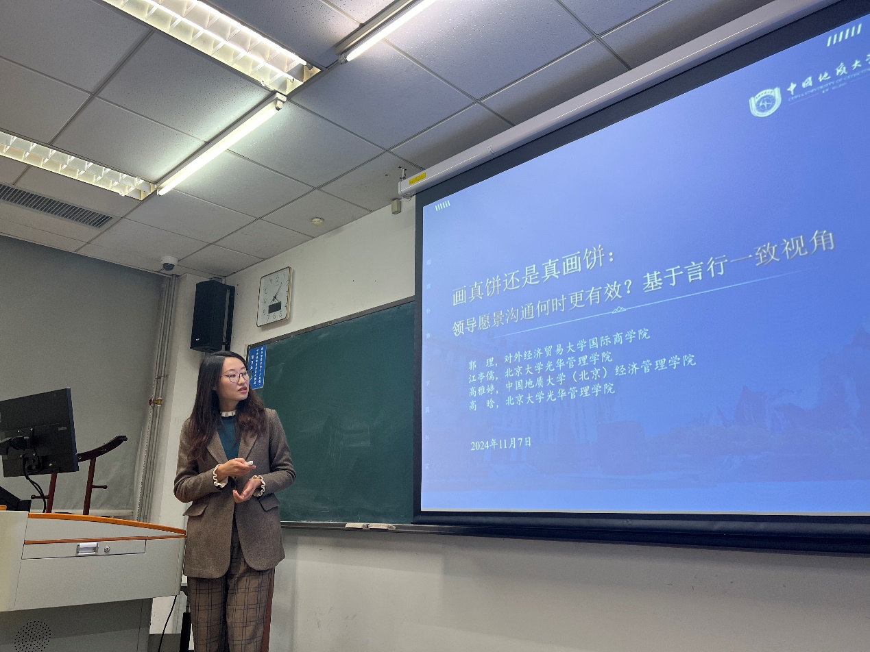 2024年11月7日下午4时,于沙河校区4号楼110教室,中国地质大学(北京)经济管理公司讲师高雅婷博士应邀为suncitygroup太阳成集团师生开展题为“画真饼还是真画饼:领导愿景沟通何时更有效?基于言行一致视角”的报告。本次讲座由吴国滨老师主持,工程与项目管理专业24级硕士生参加了讲座。