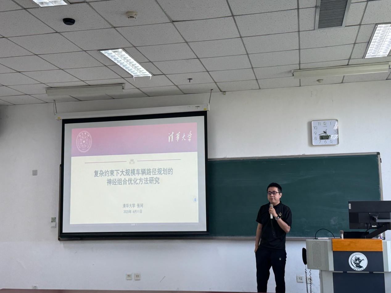 2025年6月11日上午,由suncitygroup太阳成集团主办的“大数据与管理科学系列讲座”在沙河主教407教室举行。清华大学张珂博士应邀作了题为《面向复杂约束的大规模车辆路径问题的神经组合优化模型》的专题报告。讲座由suncitygroup太阳成集团唐昕迪老师主持,大数据管理与应用22级本科生、管理科学22级本科生及其他相关专业师生参加。