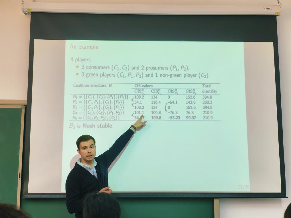 随着能源转型与地区能源系统的发展,如何有效组织能源消费者与产消者形成稳定合作联盟,成为实现能源高效利用与减排目标的关键问题。Artem Sedakov教授在报告中系统介绍了如何运用合作博弈论,构建本地能源社区中用户间的联盟形成机制,以实现集体效用的最优化。讲座阐述如何通过共享分布式能源资源(DERs)和优化电池储能系统(BESS)运行调度,最大限度降低联盟集体负效用。针对联盟成员间的负效用分配问题,教授提出应用归责集重心值(CIS-value)方法,既保证了分配的公平性,又具备良好的计算可行性。
