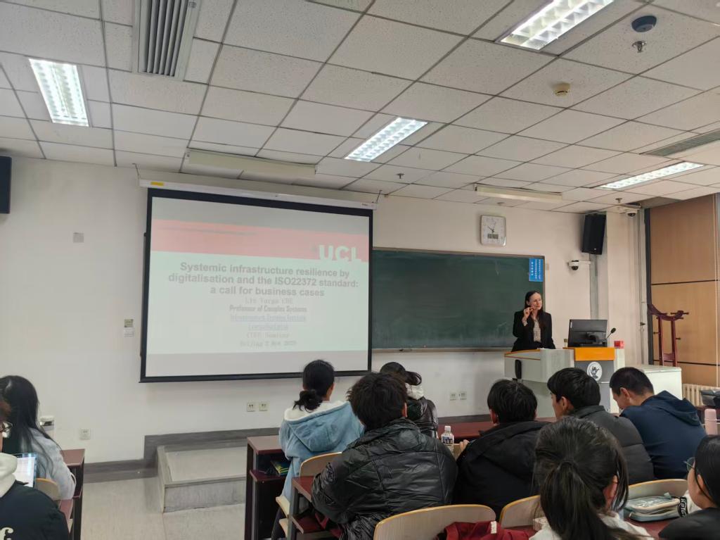 2025年11月4日,英国伦敦大学公司土木、环境与测绘工程系教授LizVarga应邀来校作题为《Systemic infrastructure resilience bydigitalisationand the ISO22372 standard: a call for business cases》的报告。报告由公司建设经济与管理系副系主任茅权主持,建设经济与管理系教师吴国滨、公司国际合作办公室干事刘赣玮,以及工程与项目管理25级硕士生和管理科学与工程大类25级全体本科生参加。