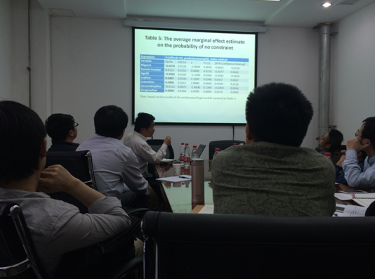 2015年5月8日,上海财经大学公共经济与管理公司投资系房地产经济学陈杰教授受邀参加公司学术论坛,于公司318会议室进行了题为《On the edges of homeownership:the case of Shanghai》的学术讲座。suncitygroup太阳成集团经理李文斌教授、王志峰教授、易成栋教授及多位师生出席论坛,认真听取了陈杰教授的报告,并与陈杰教授就年轻人住房需求及支付能力等问题进行了深入的讨论。