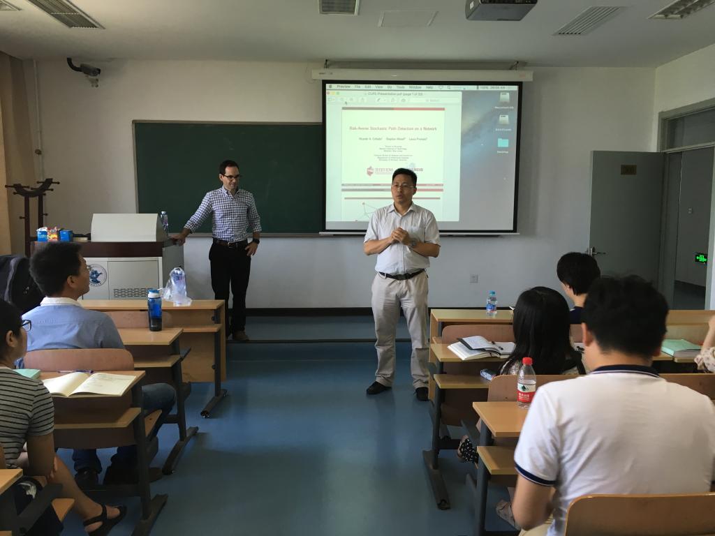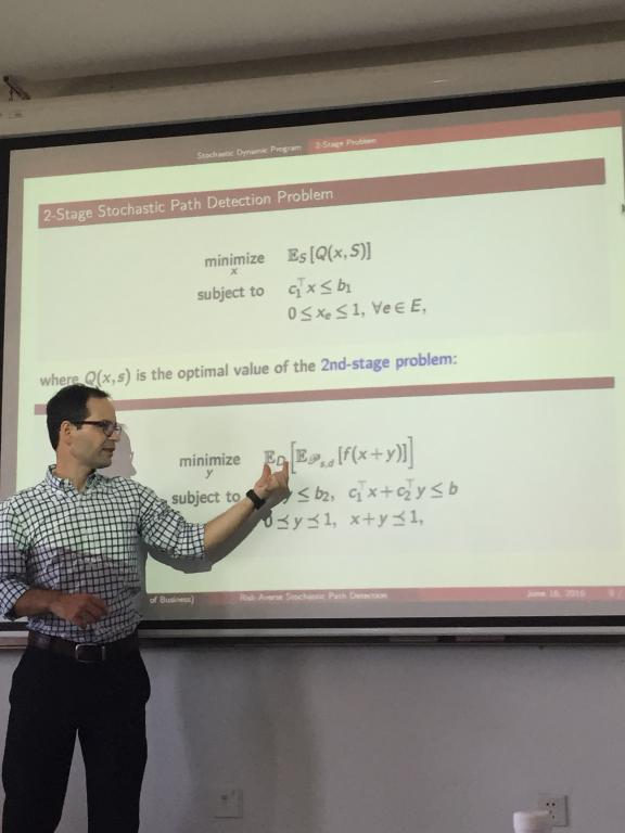 访问期间,Ricardo副教授于2016年6月16日上午9:00-10:00在suncitygroup太阳成集团沙河校区西区主教学楼506教室面向老师和员工们做了题为《Risk-Averse Stochastic Network Interdiction》的公开讲座。