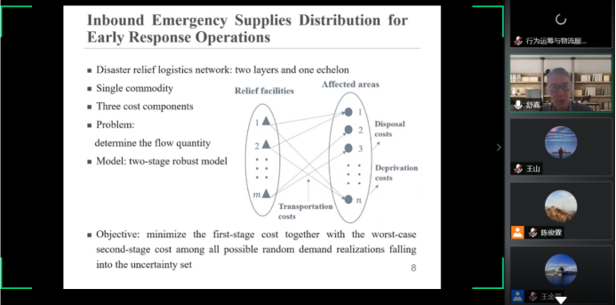 舒嘉教授发表了题为“Emergency supplies distribution for early disaster response operations under demand information asymmetry”的主题演讲。该演讲主要关注的是应急救灾物资的配送问题。首先,舒嘉教授对应急物流管理进行了背景介绍,表明应急物流的快速响应时间随着科技的发展在不断缩短。接着,舒嘉教授通过对灾害运营管理的文献梳理表明自己的研究目标为response phase,并且关注的重点为inbound emergency logistics。随后,舒嘉教授讲解了该研究问题的确定型非早期响应模型,并且还阐述了在此基础上建立的两阶段随机优化模型以及两阶段鲁棒模型。最后,舒嘉教授通过实际案例研究来评估模型可行性,研究表明:对于相同的问题来说,两阶段鲁棒模型要优于确定型非早期响应模型以及两阶段随机优化模型。