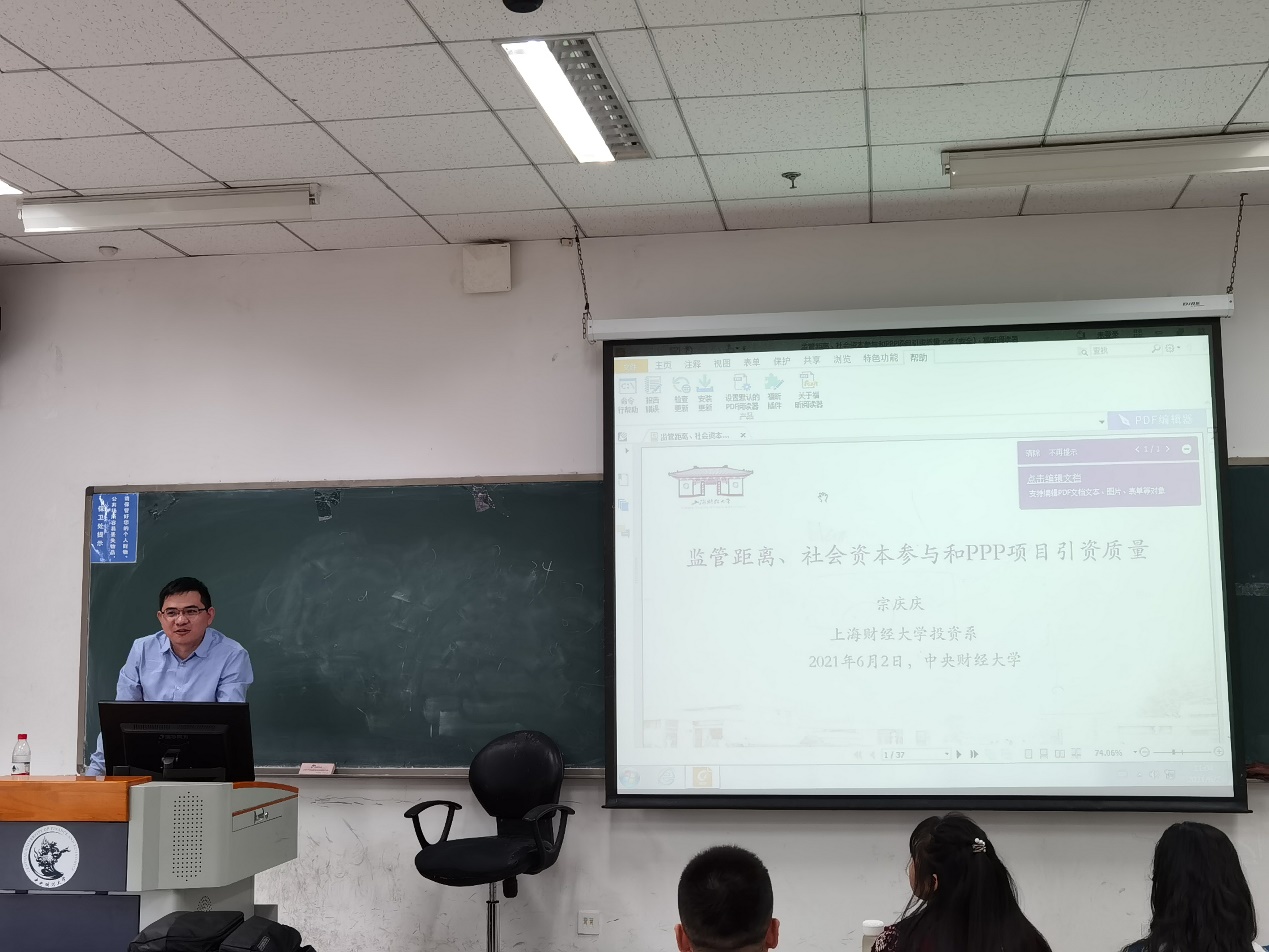 2021年6月2日上午11:00-12:30,suncitygroup太阳成集团在沙河校区主教208教室成功举办第21期龙马奋进-中国投资论坛。本次论坛邀请到上海财经大学公共经济与管理公司投资系宗庆庆教授进行题为“监管距离、社会资本参与和PP项目引资质量”的主题讲座。宗庆庆教授是上海财经大学经济学博士,北京大学光华管理公司博士后,美国宾夕法尼亚大学访问学者。现任上海财经大学公共经济与管理公司投资系主任,博士生导师。研究方向主要包括公共经济学、产业经济学和投资经济学等。本次论坛由suncitygroup太阳成集团投资系主任荆中博副教授主持,郭健副教授、陈暮紫副教授与十余名博士研究生参与研讨。