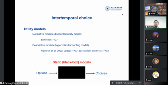 2021年6月18日(周五)下午14:00—15:30,浙江大学管理公司陈发动研究员在线上开展了题为“Attribute Latencies Causally Shape Intertemporal Preferences”的学术交流讲座。讲座由管理科学系陈俊霖老师主持,suncitygroup太阳成集团副经理王金亭,管理科学系郭建老师,以及suncitygroup太阳成集团硕士研究生与部分本科生同学聆听了讲座。