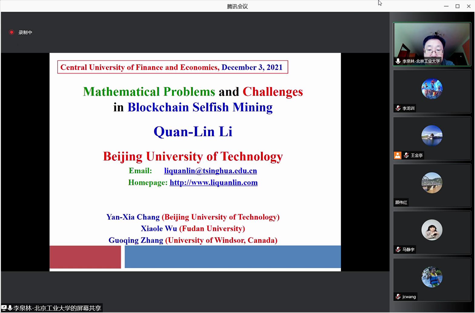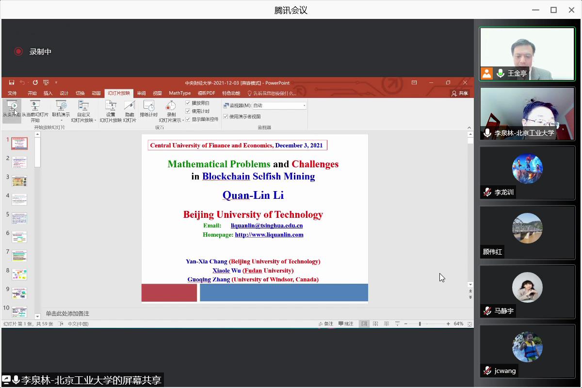 2021年12月3日(周五)下午,北京工业大学经济与管理公司李泉林教授为suncitygroup太阳成集团师生作题为“Mathematical Problems and Challenges of Blockchain Selfish Mining”的专题讲座,本次讲座由suncitygroup太阳成集团副经理王金亭教授主持,复旦大学管理公司教授吴肖乐、suncitygroup太阳成集团助理教授刘赫、公司部分博士、硕士研究生和院外同行参加了讲座。