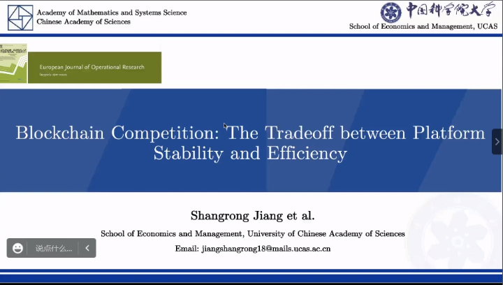 接下来,姜尚荣就区块链的网络竞争问题展开叙述。由于之前很多研究均从区块链内部出发寻找影响其发展的因素,团队本次采用博弈论模型衡量了软分叉和硬分叉的改变对平台稳定性的影响,研究在跨平台的不同竞争机制影响下区块链参与者行为和交易费用的变动,同时利用实证补充理论模型,提供了在不同竞争环境下区块链平台的稳定性和效率之间权衡的理论见解和经验证据,对于区块链平台的管理决策建设具有重要实际意义。