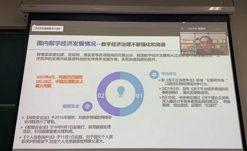 唐建国老师首先介绍了数字经济的内涵和外延:根据《二十国集团数字经济发展与合作倡议》,数字经济是指以使用数字化的知识和信息作为关键生产要素、以现代信息网络作为重要载体、以信息通信技术的有效使用作为效率提升和经济结构优化的重要推动力的一系列经济活动。根据《“十四五”数字经济发展规划》,数字经济是继农业经济、工业经济之后的主要经济形态,是以数据资源为关键要素,以现代信息网络为主要载体,以信息通信技术融合应用、全要素数字化转型为重要推动力,促进公平与效率更加统一的新经济形态。
