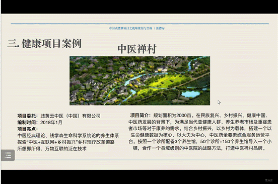 最后,汲老师结合具体的项目介绍了中国式健康项目实践,向同学们详细介绍了中医禅村、贵州贞丰对门山、水语养生小镇、洋河股份养生酒项目、古北岳森林康养小镇这个五个项目。其中,“对门山”模式是以第六产业为产业发展核心,以乡村手工业复兴为特色配套,以旧村落改造为村落文化传承,以乡村教育、乐和治理为社区生活准则,辅以山水林田的生态系统形成一个五位一体的乡村可持续发展模式;古北岳森林康养小镇以“未名慢乡、基因部落”为总体形象,以旅游为体,以产业为核,以健康为魂,布局“两个类型,三大方向”的产业发展布局,特色产业开发主要是山地森林型康养产业和中医养生产业两大产业类型,以“旅游景区业态”、“民宿度假业态”、“康养服务业态”为三大开发方向,打造新型健康服务业。