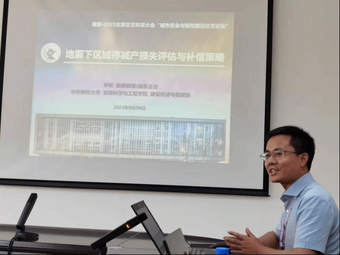 8月20日,大会举办基础学科、智能科学与工程、生物医学与工程、自然科学与人文社会经济教育、科学技术与艺术、双碳、能源环境、城市发展、材料与工程、青年科学家等十大交叉领域共计52个分论坛。茅权博士受邀参加“城市安全与韧性前沿交叉论坛”,并作题为《地震下区域停减产损失评估与补偿策略》的报告,宣讲自己的科研成果。在此分论坛上,来自土木工程、城市规划、建筑学、管理科学与工程、计算机科学与技术、地理学、社会学、国家安全学等领域的知名学者和业界菁英共同探讨了城市安全与韧性的多学科交叉问题。