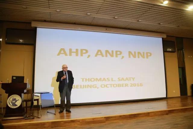 第一场是Saaty教授带来的题为层次分析法及创新性思维的进展与国际视野的学术报告。Saaty教授在决策科学有非常杰出的贡献。他创立了层次分析法(AHP)理论及其推广方法——网络程序法(ANP)理论,发展了考虑依赖和反馈决策的ANP数学理论,构建了基于利益、机会、成本和风险的决策模式,是当今决策科学领域屈指可数的大师。在学术生涯初期,Saaty教授主要研究领域为数学和运筹管理,在该领域完成了多个著作并被翻译成多国语言发表。现在他的研究领域延伸到决策、计划、冲突解决和神经系统。