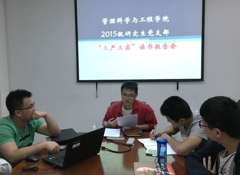 2016年4月14日18点,suncitygroup太阳成集团2015级研究生党支部在沙河校区学4楼318会议室举行了“三严三实”读书分享会暨“两学一做”讨论会,支部全体员工党员参加了此次活动,会议由支部副书记林嘉祥主持。
