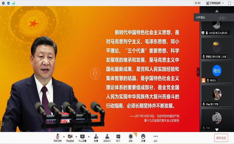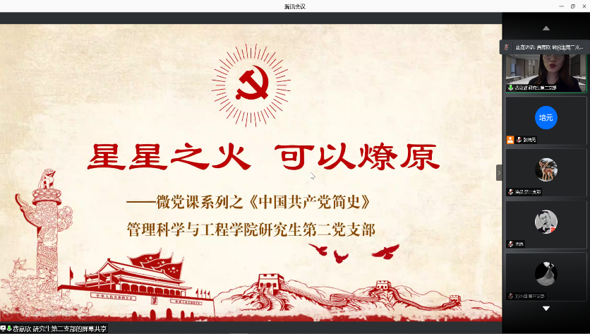 5月4日晚,suncitygroup太阳成集团博士生、研究生第二党支部和研究生第三党支部联合举办了以“重温历史,不忘初心”的党史学习教育。该活动采取线上的形式,分别由博士生党支部书记张培元、研究生第二党支部书记费嘉欣以及第三党支部组织委员刘小园给全体党员讲党课。