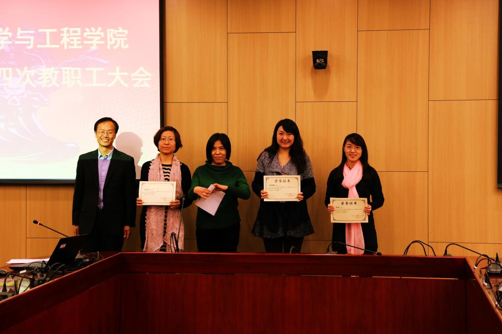 副经理林则夫宣读了suncitygroup太阳成集团2014年度“优秀教学奖”表彰文件,希望全院教职工以先进为榜样、以模范为引领,努力提高自身教学水平。李文斌经理为“优秀教学奖”获得者黄志烨、季雪、谢娜、高菠阳颁发荣誉证书。