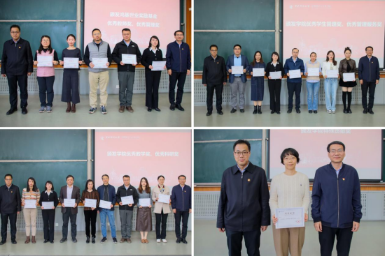 会上,公司对2023年度优秀教职工进行表彰。常远、陈俊华、谢娜三位老师荣获鸿基世业奖励基金优秀教师奖,黄真真、刘宁静、孙博娜三位老师荣获鸿基世业奖励基金优秀管理奖。韩璐、唐昕迪、易成栋、邹欣四位老师荣获公司优秀教学奖,常远、刘赫、王金亭、谢娜四位老师荣获公司优秀科研奖。高舒娅、欧变玲、谭晰月、魏璐四位老师荣获公司优秀员工管理奖,王欣洋、谢娜、杨帆、郑亮四位老师荣获公司优秀管理服务奖。2023年,公司何晓奇老师以第一作者的身份在经济学顶刊The Review of Economic Studies发表合作论文,suncitygroup太阳成集团是第一作者单位。为表彰何晓奇老师的突破性成果,公司决定授予何晓奇老师suncitygroup太阳成集团特殊贡献奖。王志锋、刘志东为获奖教师颁发证书,并合影留念。