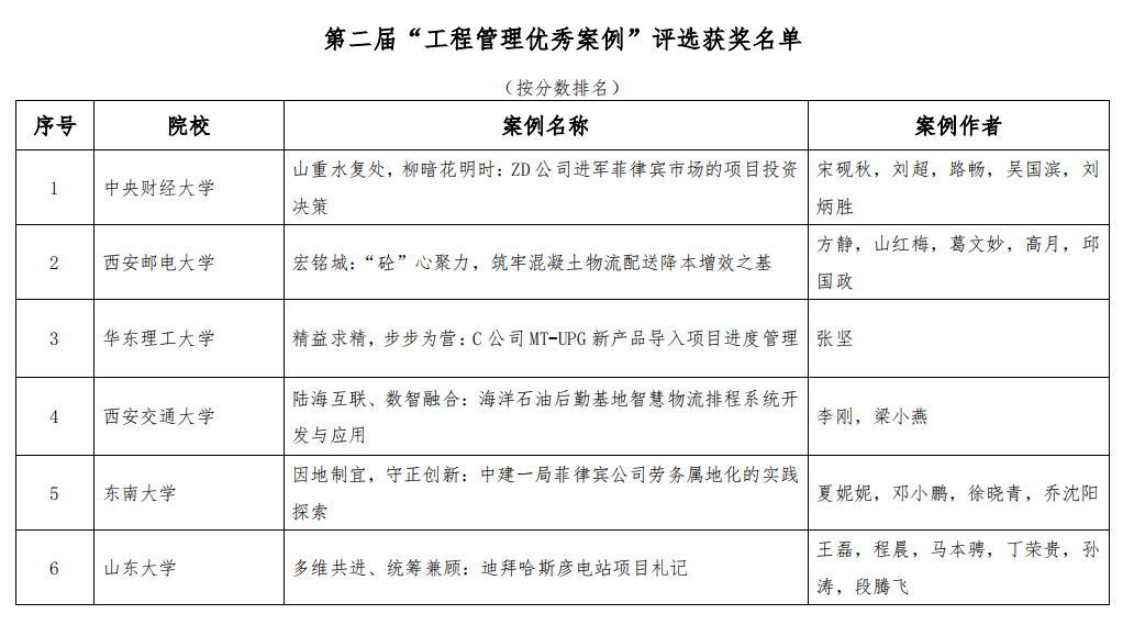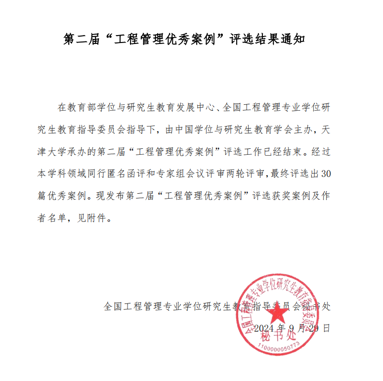 近日,全国工程管理专业学位(MEM)研究生教育指导委员会公布由中国学位与研究生教育学会主办,天津大学承办的第二届“工程管理优秀案例”评选结果。公司宋砚秋教授、2024级硕士刘超、2024级博士路畅、吴国滨助理教授、河北工业大学刘炳胜教授共同开发的教学案例《山重水复处,柳暗花明时:ZD公司进军菲律宾市场的项目投资决策》被评为优秀案例,入选中国专业学位案例中心工程管理硕士专业学位案例库。此次荣获“工程管理优秀案例”奖项,标志着公司在MEM领域的教学与研究成果首次得到了权威机构的充分肯定,充分展现了公司在该领域的卓越成就和专业实力。