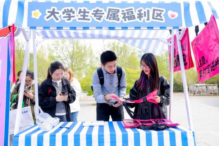 科技展示区的人气最为火爆。在龚乐水、赵红艳、梁沣华等志愿者的引领下,同学们通过扫码使用AI技术,上传照片并选定喜爱的风格,生成漫画形象。志愿者也提醒了同学们要小心AI换脸的金融骗局,妥善保护个人信息。此外,“老员工专属福利区”为同学们提供了学习生活的一站式解决方案,员工特权福利让同学们直呼“超值”。志愿者付佳瑞、李展天、梁沣华协助分发的“显眼包”袋子,也为校园添上一抹亮丽色彩。
