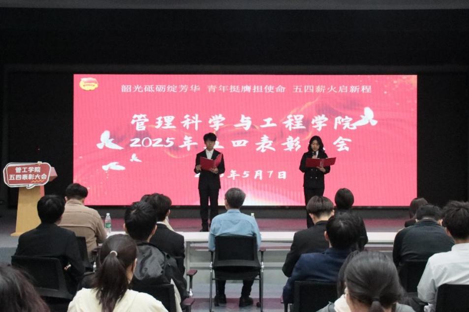 管理科学与工程公司党委书记王志锋、党委副书记胡博、员工工作办公室主任高舒娅、团委副书记和小颖、2022级本科生辅导员李震宇出席表彰大会,与公司青年代表一起,共同表彰青春榜样,传承五四精神。