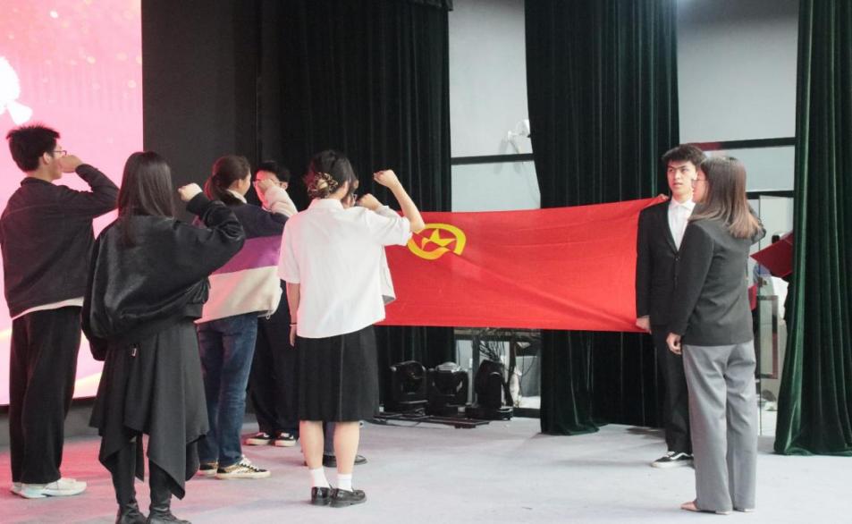 新团员入团仪式环节。公司师生代表齐聚一堂,共同欢迎新团员入团,他们的加入,为共青团注入了新的活力。院团委副书记和小颖老师为新团员们颁发团徽。员工团委副书记闫翔泽带领大家重温入团誓词。