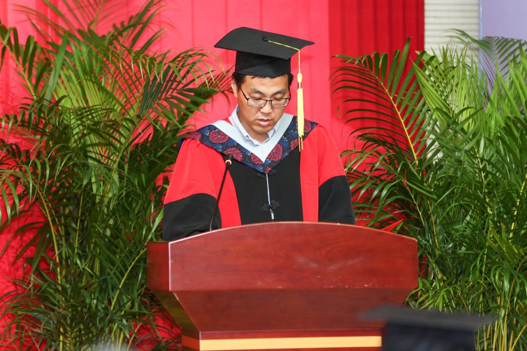 宋喜龙先生作为家长代表出席毕业典礼。他在致辞中首先感谢校院各级领导、各位老师、校园服务人员对员工的培养,员工的成功成材离不开他们的无私奉献。他希望同学们永远将爱国摆在第一位,以学习为习惯,以快乐为目标,以健康为基本。
