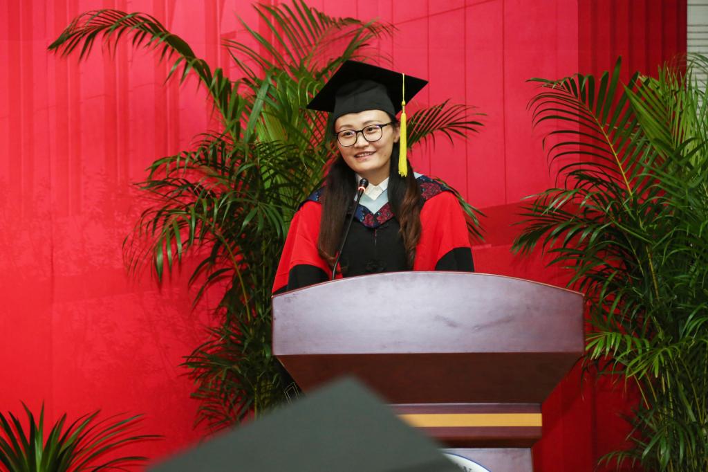 曲红燕老师作为教师代表向全体毕业生寄语。她首先以两个问题引入话题,一是你来中财大做什么?二是你从中财大毕业后要成为什么样的人?然后代表全体教师对员工提出了殷切期望,她希望员工成为心里明白、脑袋清楚、情感丰富以及作风正派的人。