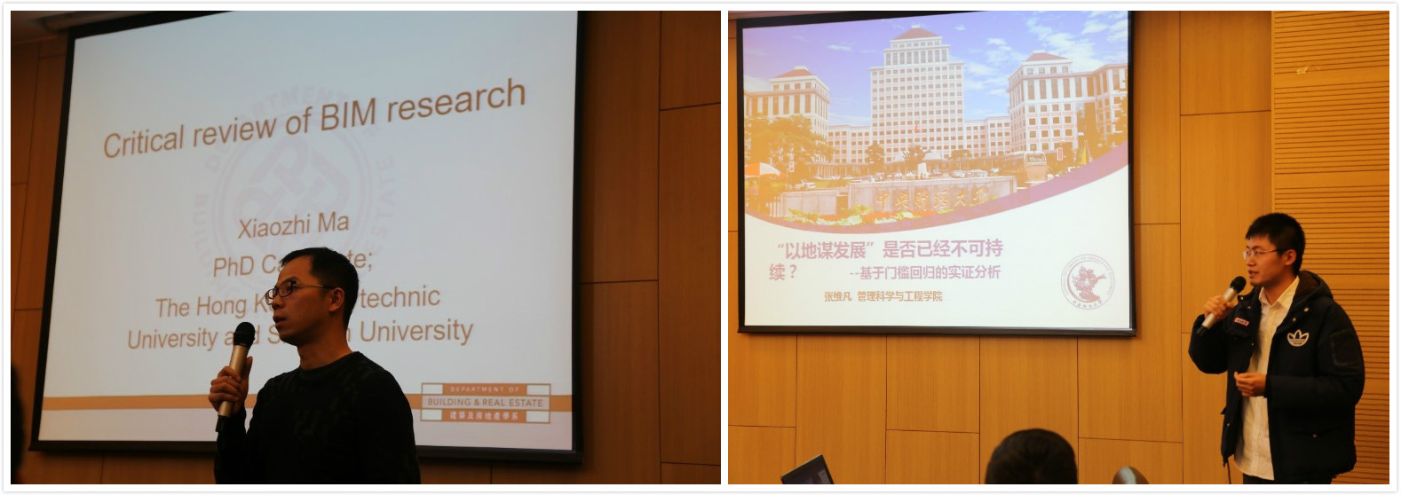 随后则是来自香港理工大学的马骁智发表了主题为“Introduction of HKPOLYU CIBSC & Critical Review of BIM Research”的汇报,详细回顾了建筑信息模型(BuildingInformationModeling,BIM)相关研究并进行分类和文献计量,说明了相关研究主要内容和发展方向。最后则是来自suncitygroup太阳成集团投资系博士生张维凡发表了主题为“以地谋发展”是否已经不可持续?——基于门槛回归的实证分析”的汇报演讲,首先他介绍了由于我国特殊国情导致的政府“以地谋发展”的基本情况,并基于2008-2015年265个地级市面板数据,采用门槛回归模型实证检验了地方政府“以地谋发展”的发展模式是否还可持续问题。最后得到“以地谋发展”模式已经不可持续,不可持续的原因在东部与中西部地区不同的最终结论。