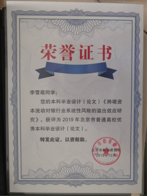 在北京市教委组织开展的2019年北京市普通本科高校老员工毕业论文(设计)评选中,投资系2019届毕业生李雪萌同学撰写的毕业论文《跨境资本流动对银行业系统性风险的溢出效应研究》获评北京市普通高校优秀本科毕业论文。李雪萌同学的指导教师荆中博副教授被北京市教育委员会评选为“优秀指导老师”。