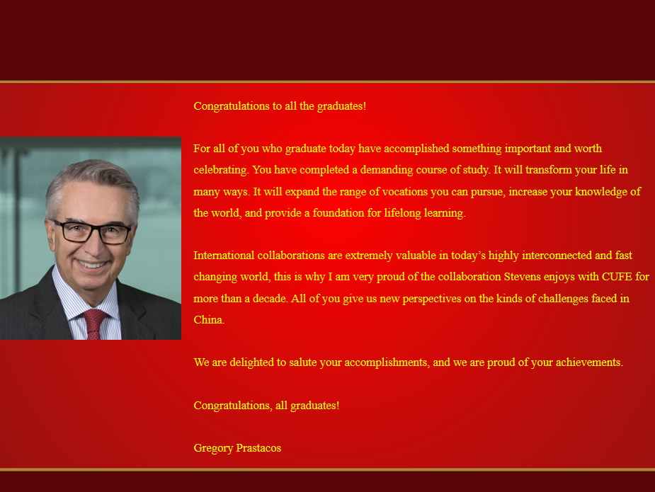 作为美国史蒂文斯理工公司商公司的经理,Gregory教授因为时间原因未能出席本次毕业典礼,但是他给项目十二期毕业生发来了贺词,贺词由冯怡老师代读。Gregory教授首先表达了他对毕业生们的祝贺,他表示同学们在学习的过程中扩大了自己可以从事的职业范围,增加了对世界的了解,并为终身学习提供了基础。最后,他表达了对今后项目合作的期许,希望今后的项目能够欣欣向荣,越办越好。