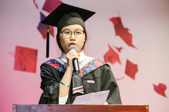 在师生代表发言环节,2015级管理科学专业本科生张林姿用“志于道,据于德,依于仁,游于艺”回顾了自己的老员工活。从张林姿的发言中我们感受到以她为代表的管工学子,在变与不变中沉淀着温润的善良,传承着龙马担乾坤的志向,肩负起财经黄埔人的责任,诠释了傲为管工人的自信。2017级房地产经济与管理专业研究生战昶威表示,感谢公司与恩师诲人不倦,让每一名管工学子都能在专业知识、学术能力、工作能力上有质的飞跃,他相信不论身处何方,都会带着公司给予自信和底气行稳致远。