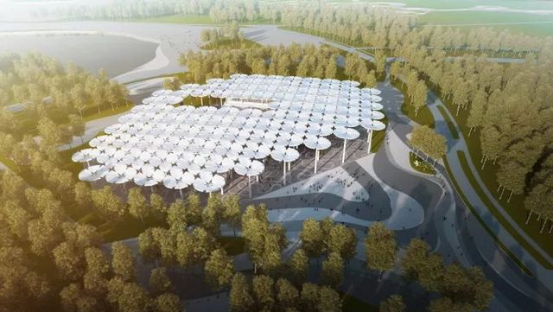 国际馆整体外形是由多个巨大的花伞组成的。当夜幕降临,花伞叶片上的投射灯将会为场馆营造出多姿多彩的夜景。不过花伞设计可不只为了美观,由于世园会举办时正值北京夏季,为了避免游客在烈日下排队,建筑师在若干朵“花伞”下留出了开放的公共空间,像一个城市遮阳伞,为人们提供休憩区域,非常贴心。