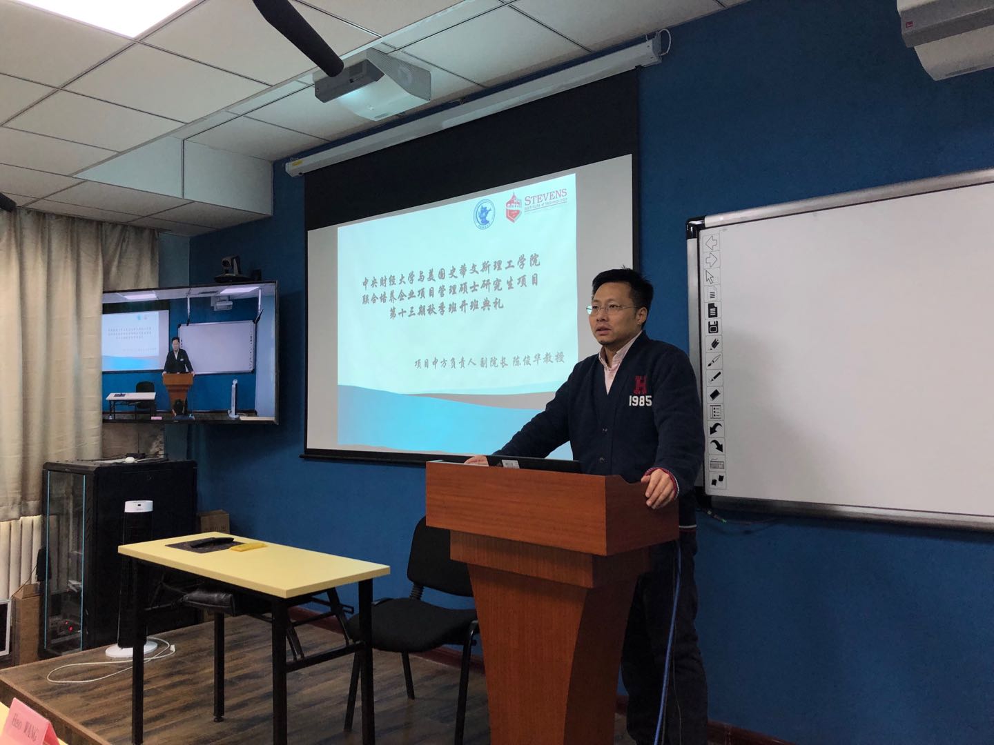 典礼开始,作为中财史蒂文斯项目的中方负责人,suncitygroup太阳成集团副经理陈俊华教授对十三期秋季班同学们表示了热烈的欢迎。接下来,陈俊华副经理介绍了史蒂文斯项目的基本情况。从2004年开始,中财史蒂文斯项目已经走过了十几年的时间,培养了一大批优秀的学员,并受到业界、用人单位和学员等各方的一致好评。未来suncitygroup太阳成集团和史蒂文斯理工公司将继续通力合作,培养具备扎实理论基础、精通专业知识、具有国际视野的高水平管理人才。陈俊华副经理同时就项目的教学组织安排、团队队伍、选课缴费、申请毕业等相关注意事项向同学们做了详细介绍。