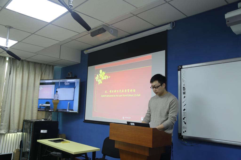 经理助理王昊副教授作为教师代表致辞,他首先祝贺大家的入选项目,并对同学们提出了三点希望和建议:调整状态,明确目标;迎接挑战,勇于开拓;资源共享,协作共赢。在最后,王昊老师希望同学们在学习之余利用好项目搭建的平台和两校的资源,在两年的学习生活中可以收获满满。