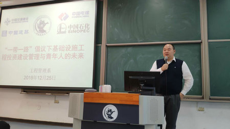 2018年12月25日上午10:00-12:00,中国交建海外事业部副总经理施颖陶先生,中国建筑海外事业部投资部副总经理蒋超先生,中国石化炼化工程集团国际项目风险管理负责人金峰先生,中国电建海外事业部战略规划处副处长马峰先生受公司工程管理系教师邀请,在沙河校区西区102与管理科学与工程2018级全体同学开展精彩对话活动,活动由李玉龙副教授主持,公司经理李文斌教授也出席了此次活动。