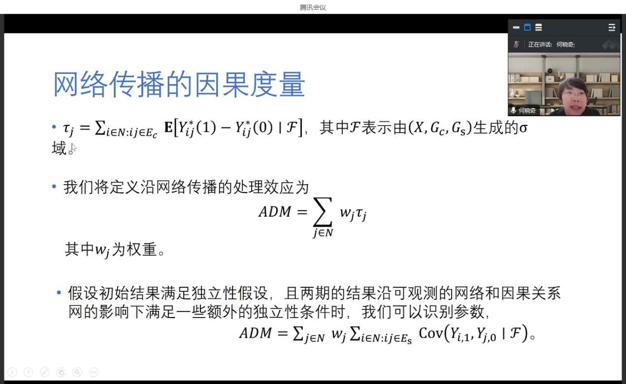 第二场学术讲座由公司何晓奇助理教授主讲。讲座分为两部分,第一部分介绍了在顶级经济学期刊The Review of Economic Studies接收发表的研究成果“Measuring diffusion over a large network”, 论文主要分享了建模过程,该论文的主要贡献是在社会网络模型下,确立了个体行为交互影响的溢出效应是来自于关系网络,而不是个体特征,或者其他的环境相关性造成的,这对推动因果关系在网络溢出效应的理论发展具有重大意义。第二部分分享了自己的研究历程和一些心得体会,研究需要有兴趣也需要有毅力,此外踏实的基本功,持续的文献梳理和学习都是研究的必要手段,借此与同学们共勉!