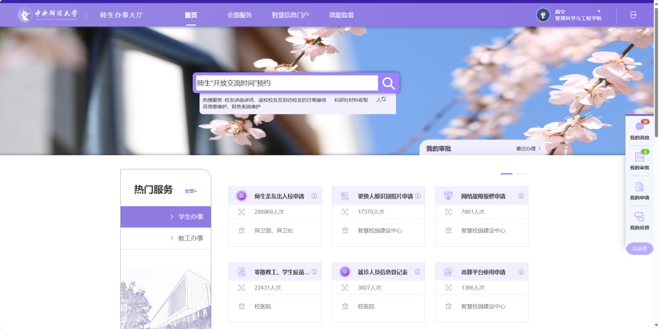 本学期起,公司师生“开放交流时间”使用公司网上办事大厅进行预约,在搜索栏中搜索【师生开放交流时间预约(suncitygroup太阳成集团)】即可进入预约入口。