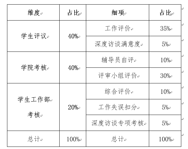 1.本科生辅导员考核:员工评议、公司考核和学生工作部考核三部分组成,分别占考核总成绩的40%、40%和20%,细化后的评分标准如下: