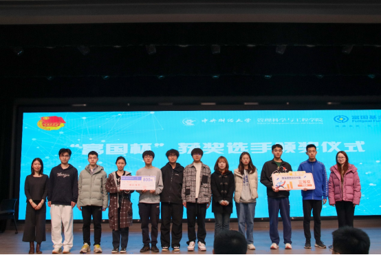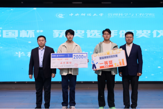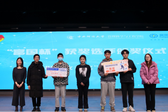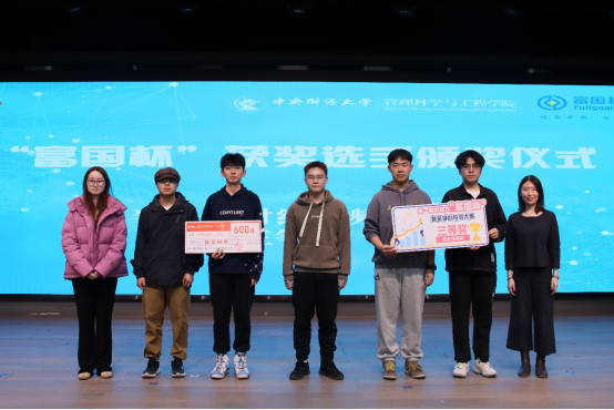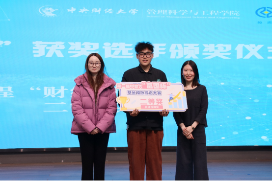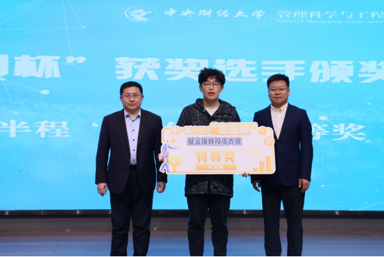 颁奖环节中,主持人宣读了本次“富国杯”基金模拟投资大赛“半程收益奖”“半程财经视频奖”的获奖者名单,由嘉宾依次为获奖同学颁发证书,并与获奖同学合影留念。