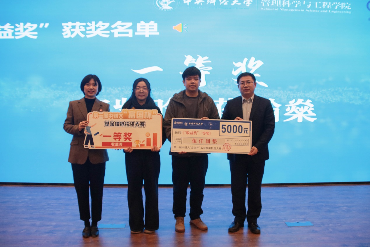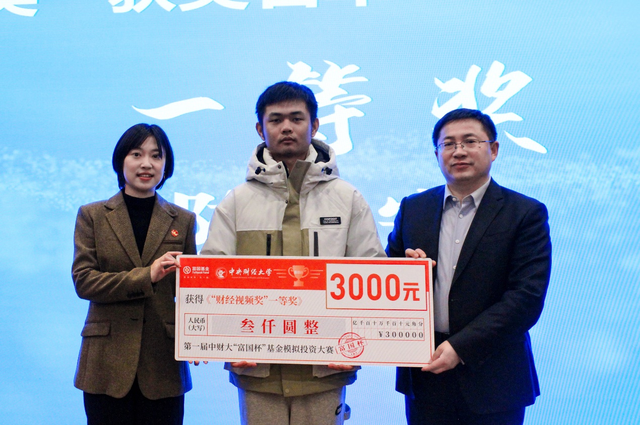 颁奖环节中,主持人宣读了中财大“富国杯”基金模拟投资大赛第一届全程赛“收益奖”和“财经视频奖”的获奖选手名单,由嘉宾依次为获奖同学颁发证书,并与获奖同学合影留念。