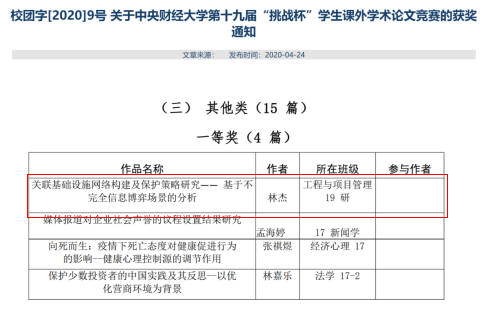 “挑战杯”员工课外学术论文竞赛,由校团委于2019年12月—2020年4月举办,本次竞赛共收到333份参赛作品,分为经济类、管理类和其他类三个类别,最高奖项一等奖获奖论文共计19篇。其中,林杰研究生以《关联基础设施网络构建及保护策略研究——基于不完全信息博弈场景的分析》获得其他类一等奖。