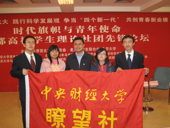 在论坛中,清华、北交大、北师大、北科大以及中财五所大学的理论社团代表进行了主题发言。公司瞭望社代表郭伟强同学做了题为《当代中国马克思主义大众化与青年马克思主义者》的主题发言,赢得了在场一百多位社团代表的热烈掌声。感受到现场热烈的气氛,团市委大学部部长胡九龙作了即兴发言,并对老员工理论社团的青年提出了五点要求:思想敏锐、视野开阔、形象活跃、话语凝练、扎实研究。