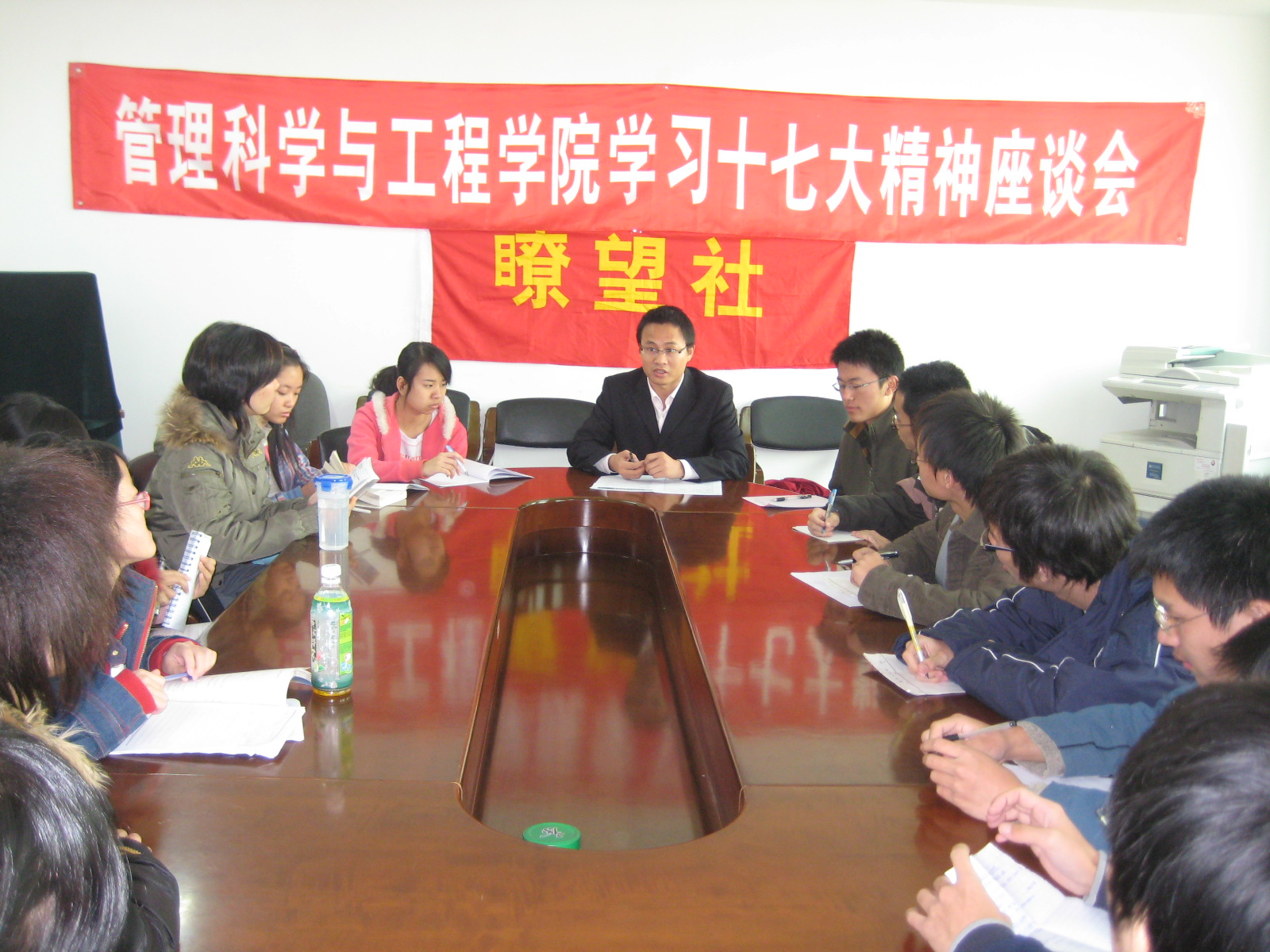 座谈会上,瞭望社成员踊跃发言,大家围绕着胡锦涛总书记的报告和十七大的有关决议进行了认真讨论,气氛十分热烈。大家重点围绕“科学发展观”、“以人为本”、“和谐社会”和“关注民生”等关键词,并联系自身学习、工作和生活实际,提出了对理论性社团工作、和谐校园建设、老员工自身发展等方面的看法。