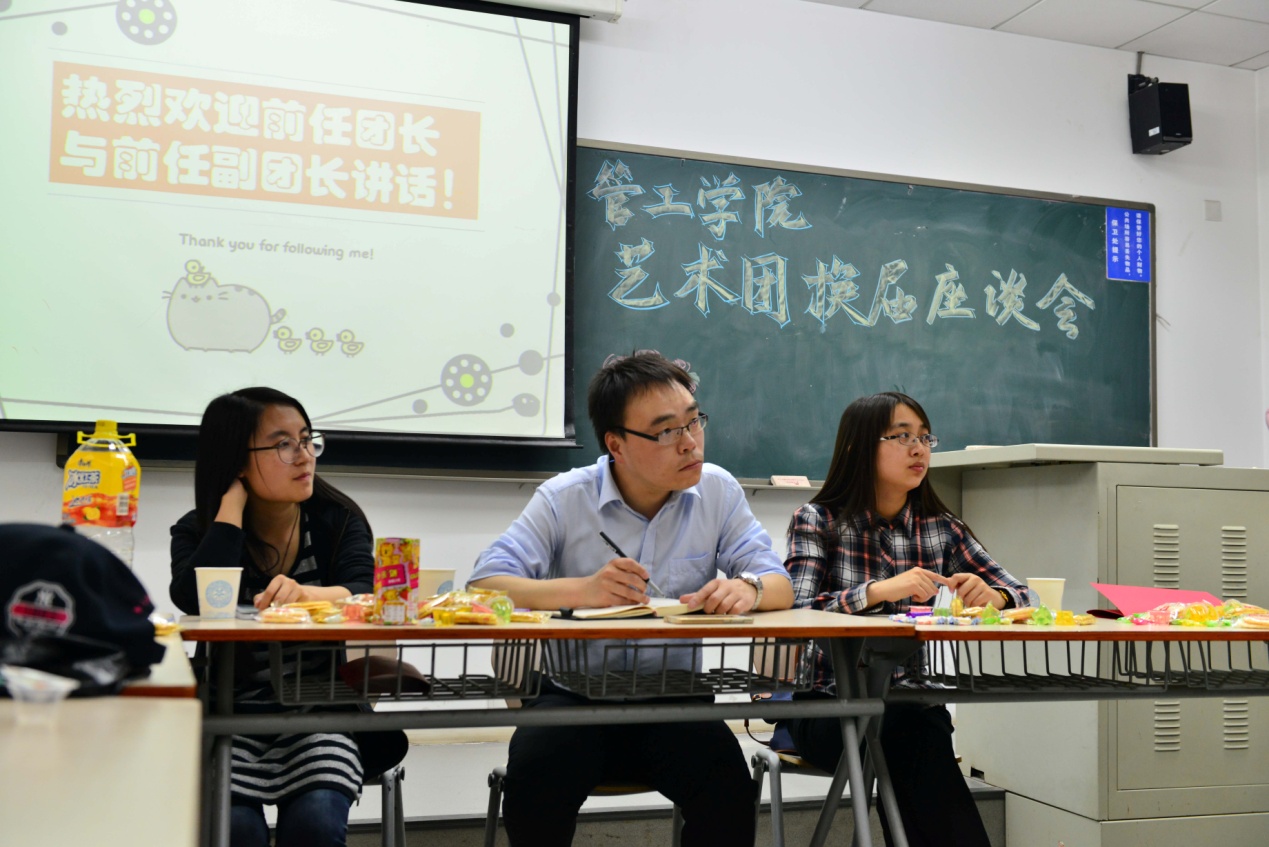 老师和团员们讨论了关于艺术团训练的时间、场地安排的问题。之后,对于如何给团员们营造更好的学习氛围、如何扩大社团、如何与其他社团合作、以及如何14级的新团员和13级的老团员也都分别发表了自己的看法。