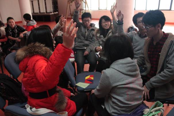 马老师介绍完毕后,同学们通过报数,被随机分成了七个组。随后,老师给各个组发了任务卡片,和完成任务需要的道具——七巧板以及模版图。每个组要用自己拥有的或者与其他组交换协商得到的七巧板按照模版图拼出规定的图案,每完成一个可以得一定的分数。随着马老师一声令下,活动正式开始。整个大厅瞬间热闹起来,奔走寻找目标七巧板的组长、热烈讨论还需要什么样的道具的组员们都迅速进入了角色,希望自己的组能够得到更高的分数。不到三分钟的时间,就有小组已经完成任务之一得到了加分,这时全场的气氛变得更加热烈,七巧板频繁在组之间传递着,负责拼七巧板的同学也更加专注,唯恐落后于他组。