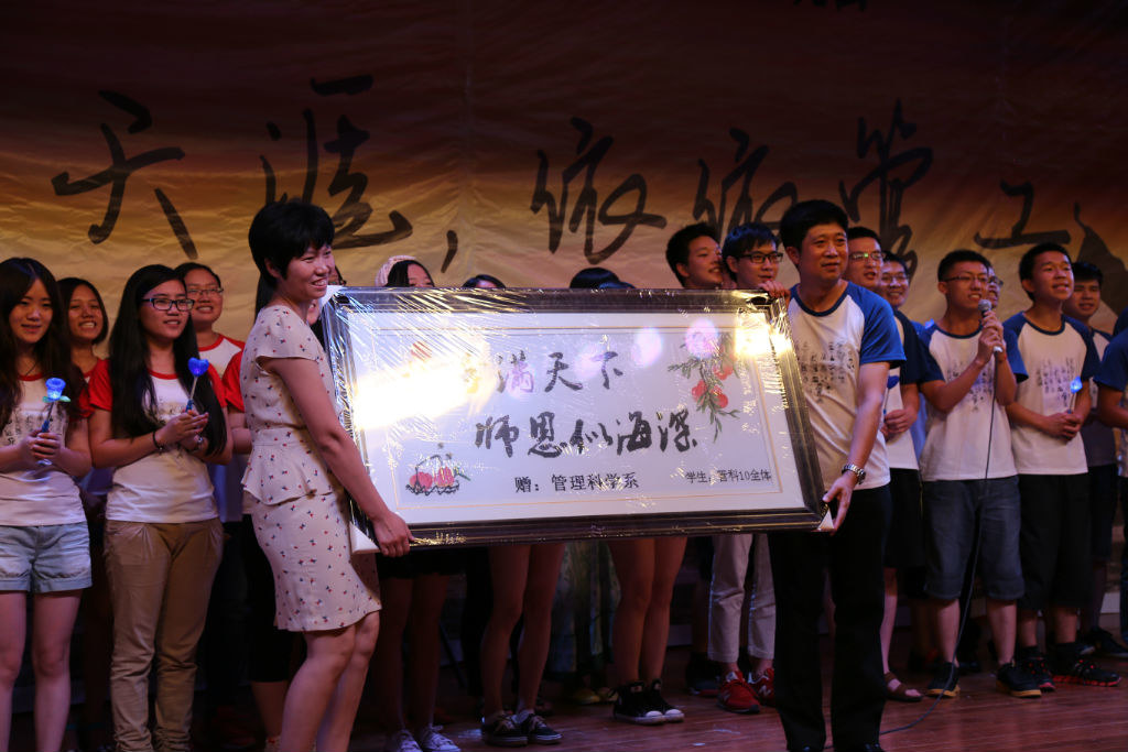 曾经作为主力阵容连续两年问鼎“中财杯”篮球赛冠军的10级的篮球队队员在临别之际对篮球队的寄语,和篮球队视频里的热血激情的比赛画面,让我们重温了那段管工“王朝模式”下激动又感动的时刻。管科10的同学们精心准备的合唱——《时间都去哪了》,让全场观众情不自禁地回忆着一路走来的点点滴滴,他们还将亲手缝制的十字绣牌匾“桃李满天下,师恩似海深”送给了培养他们四年的管理科学系。“今千里,酒一杯,声声喋喋催。问君此去几时还,来时莫徘徊。天之涯,地之角,知交半零落。一壶浊洒尽余欢,今宵别梦寒”,最后,晚会在院员工艺术团的合唱《送别》和《再回首》中落下帷幕。